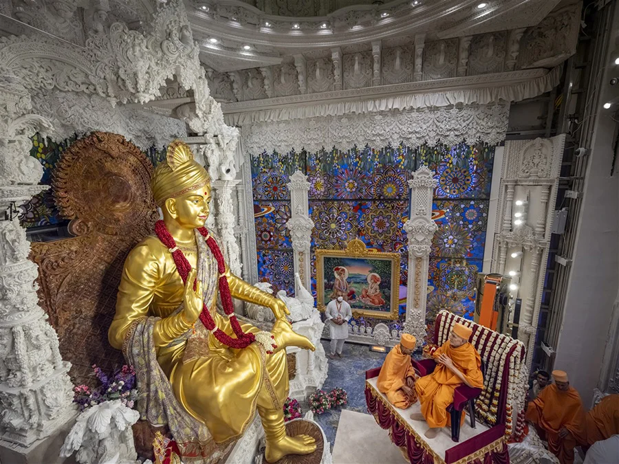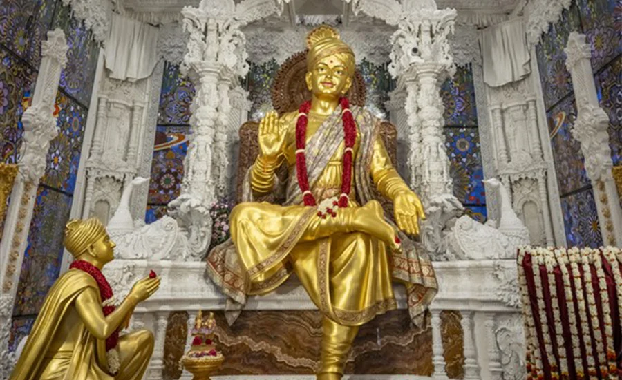 Skulpturerne i Akshardham-templet kan beskrives som en "historie om hinduistisk civilisation i sten". Fra den gigantiske statue af Bhagwan Swaminarayan, en hinduistisk åndelig leder fra det 19. århundrede, der er indviet i hovedhallen, til den 14 meter høje bronzestatue af Nilkanth Varni ved indgangen til parken, bærer hver statue religiøse fortællinger og kulturelle symboler. For eksempel står statuen af Nilkanth Varni på én fod med fodsålen opad i en yogastilling og genskaber helgenens 13.000 kilometer lange asketiske rejse fra 1792 til 1799, som varede i syv år. Dens dynamiske detaljer og religiøse implikationer er evigt frosset ind gennem kobberteksturen.